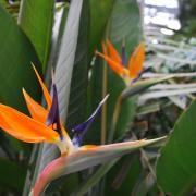 Стрелитции - удивительные растения, они опыляются не насекомыми, а птицами-нектарницами. У каждого цветка нижние синие лепестки превратились в “жёрдочку”, на которую садятся птицы полакомиться сладким нектаром. Эта “жёрдочка” с секретом – когда птица садится, под её весом открываются пыльники в “жёрдочке” и липкая пыльца прилипает к лапам птицы, которая затем переносит её на другой цветок.
